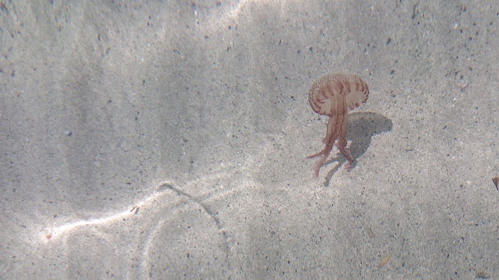 Anche se la piccola appena ha visto le meduse stava avviandosi a recitare un pezzo drammaticissimo che neanche Eleonora Duse, siamo stati fortunati e non siamo stati toccati. Va detto che la corrente le aveva trasportate verso riva e che a pochi metri non se ne vedevano. L’acqua si mantiene bassa per parecchi metri anche dopo la prima secca e soprattutto molto fredda.